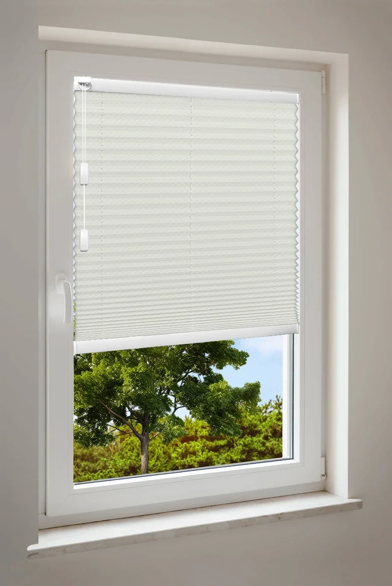 Maßgefertigtes Cosiflor® F1 Plissee in eleganten cremefarbenen Stoffvarianten – ideal für eine warme und stilvolle Raumgestaltung