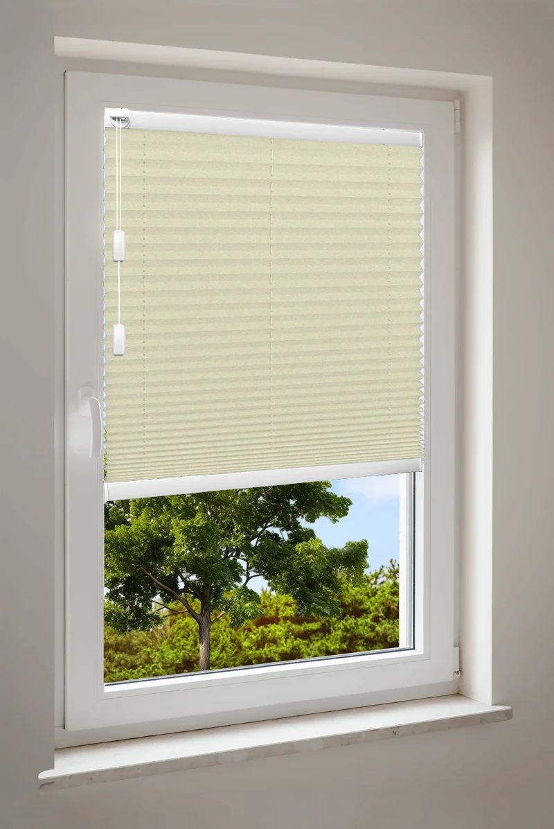 Maßgefertigtes Cosiflor® F1 Plissee in stilvollen gelben Stoffvarianten – ideal für eine freundliche und lebendige Raumgestaltung