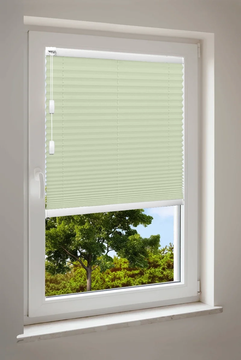 Maßgefertigtes Cosiflor® F1 Plissee in stilvollen grünen Stoffvarianten – ideal für eine natürliche und frische Raumgestaltung