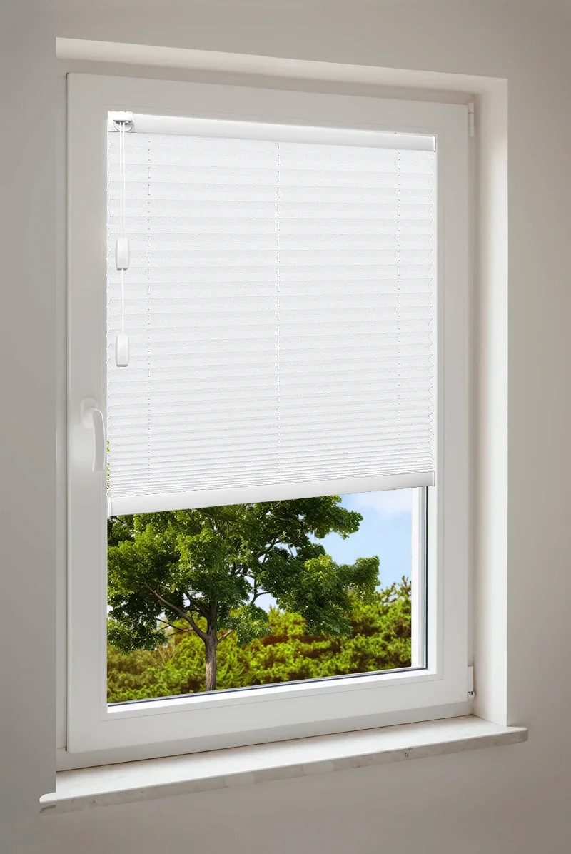 Maßgefertigtes Cosiflor® F1 Plissee in eleganten weißen Stoffvarianten – ideal für eine moderne und helle Raumgestaltung